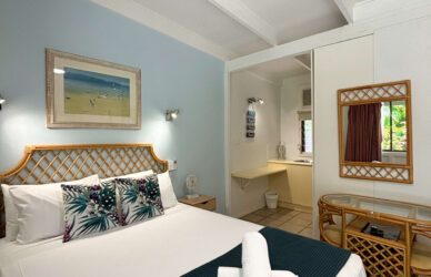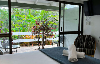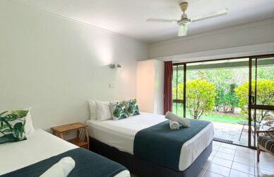 The retro-style Garden View Twin Studios are perfect for small families or those looking to share a room. Self-contained with a queen-size bed and single bed. The air-conditioned unit offers a flat-screen TV, seating area, bathroom, front patio, and kitchenette with a bar fridge, microwave, kettle, and toaster. Up to 3 guests.