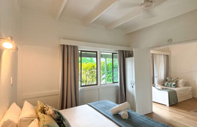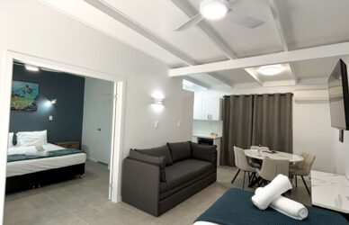 The One Bedroom Garden Studios are perfect for families and small groups. Self-contained with a queen bed in a separate bedroom and two single beds in the living room as well as a sofa bed. The air-conditioned unit offers a flat-screen TV, dining area, bathroom, front patio, and kitchenette with a fridge/freezer, microwave, kettle, and toaster. Up to 5 guests.